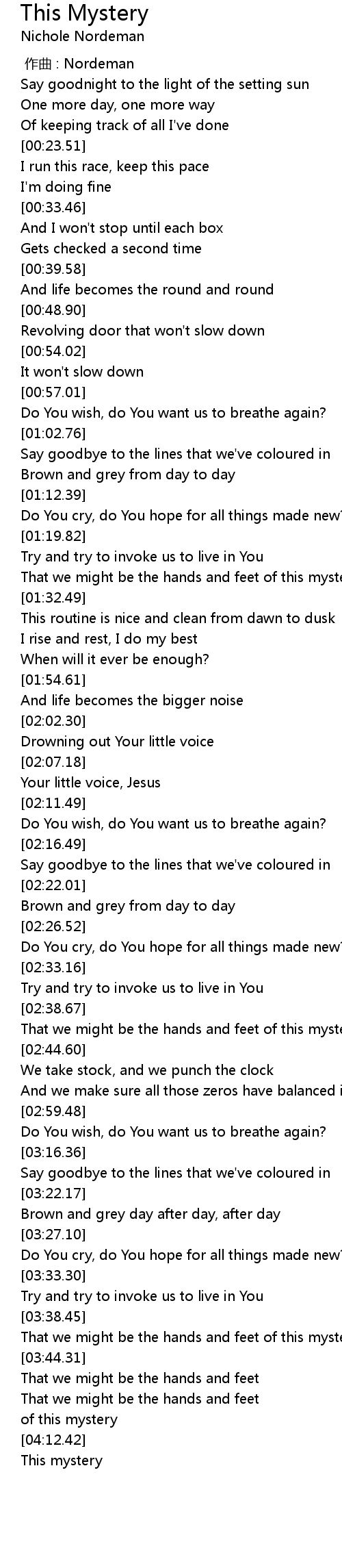 | [03:39.45] | That we might be the hands and feet of this mystery |