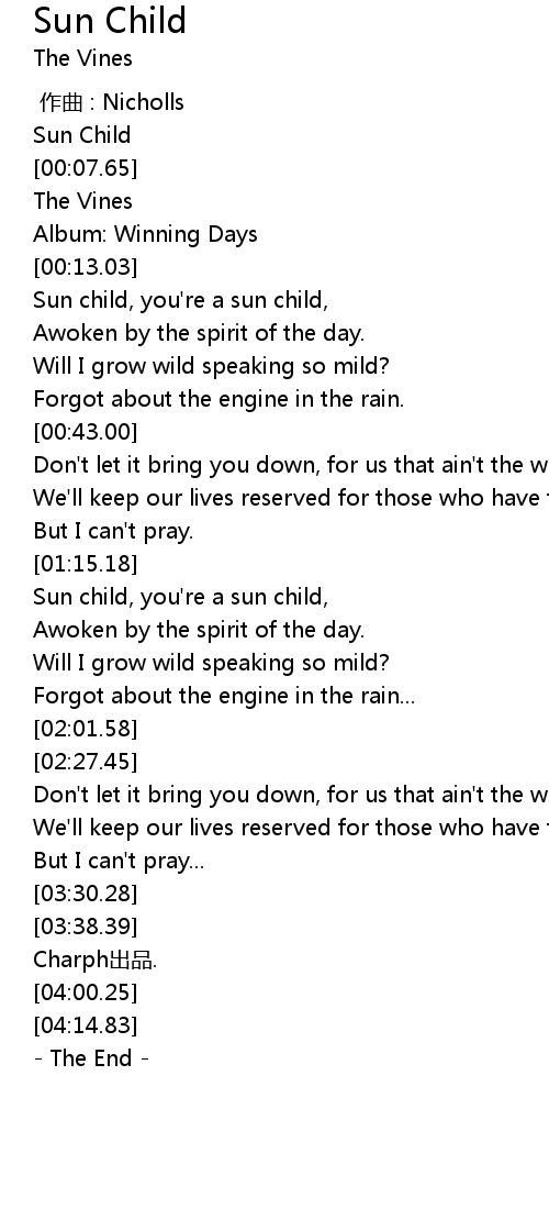 | [02:55.71] | Don't let it bring you down, for us that ain't the way. |