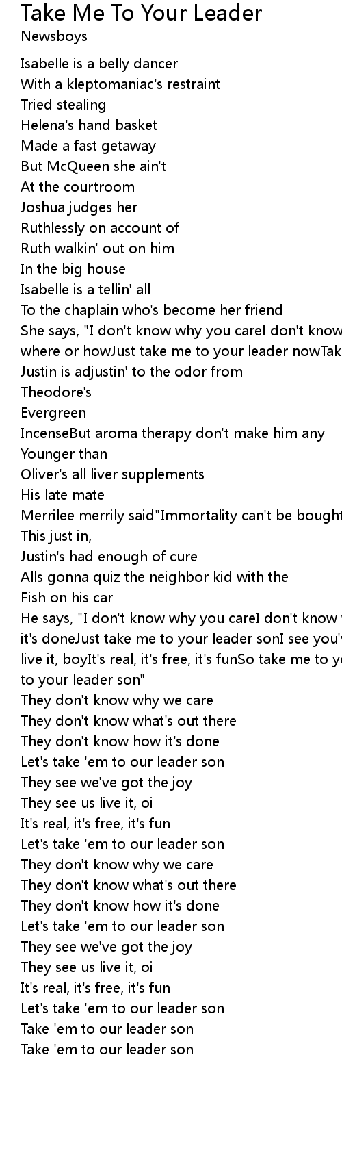 He says, "I don't know why you careI don't know what's out thereI don't know how it's doneJust take me to your leader sonI see you've got the joyI've seen you live it, boyIt's real, it's free, it's funSo take me to your leader's sonTake me to your leader son" |