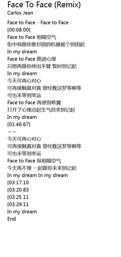 | [03:33.75][03:17.10][02:59.69] | Face to Face 再跑进心扉 |