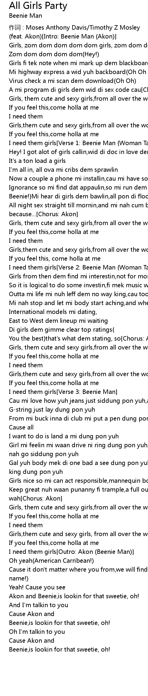 | I need them girls Verse 1: Beenie Man Woman Talking | |