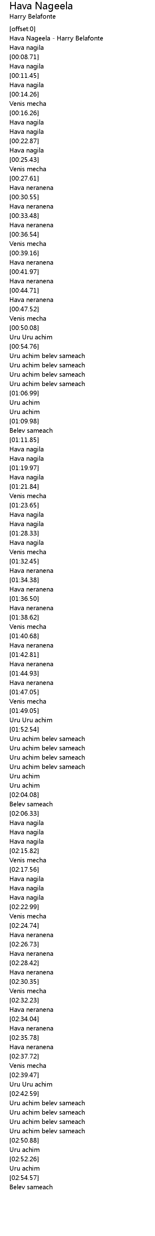 | [00:01.47] | Hava Nageela - Harry Belafonte |
