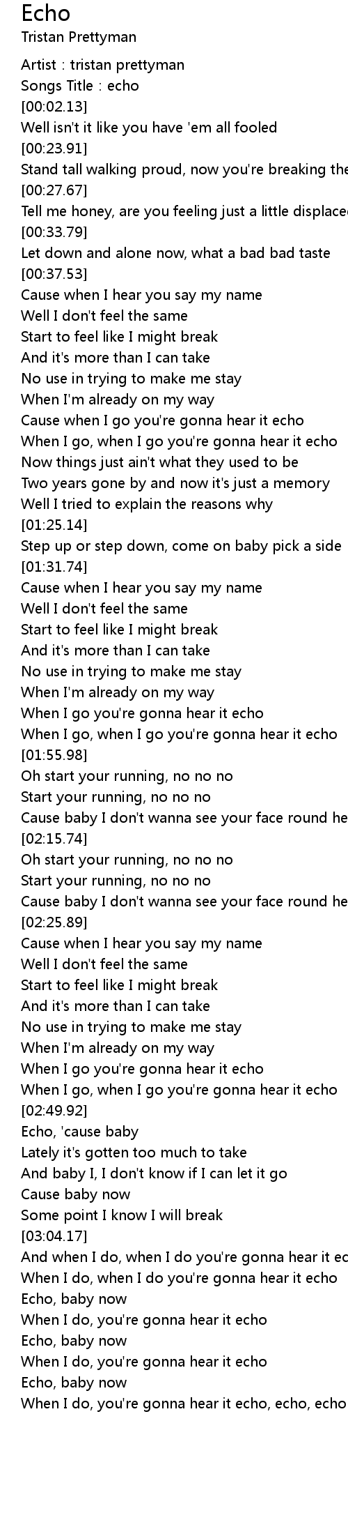 | [03:22.42] | When I do, you' re gonna hear it echo |