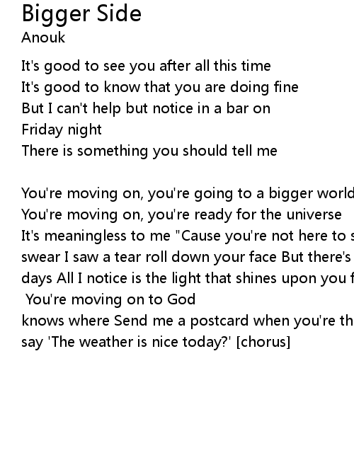It's meaningless to me "Cause you're not here to see The bigger side of me I swear I saw a tear roll down your face But there's a lot of smoke in bars these days All I notice is the light that shines upon you from aside Getting jealous of the coffee in the cup you hold so tight [chorus] You're moving on to God knows where Send me a postcard when you're there Will I remember? What will it say 'The weather is nice today?' [chorus] |
