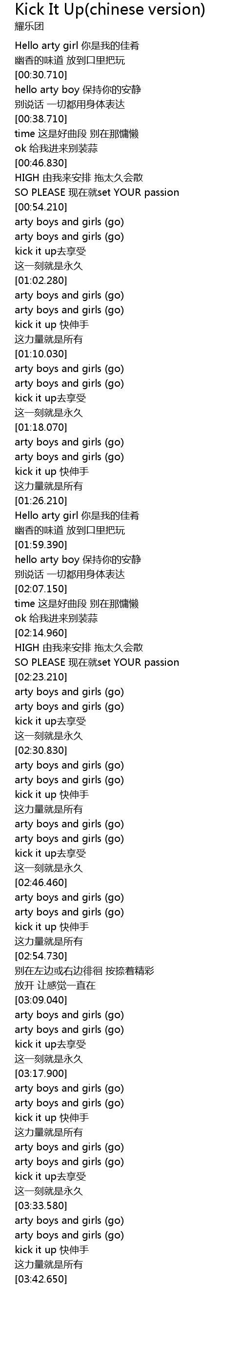 | [03:22.210] | kick it up kuài shēn shǒu |