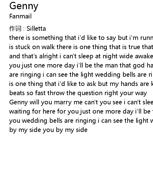 | Genny will you marry me can' t you see i can' t sleep at night wide awake im waiting for here for you just one more day i' ll be the man that god has made for you wedding bells are ringing i can see the light wedding bells are ringing you by my side you by my side |