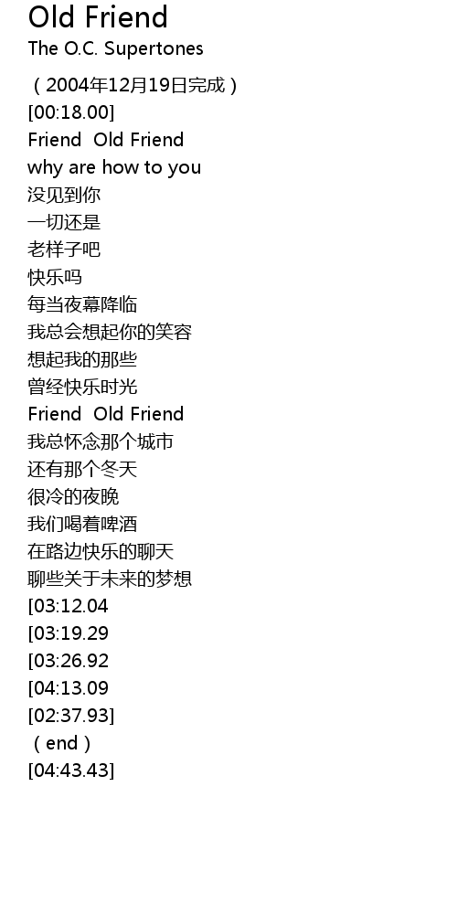 | [03:50.18][03:12.04][02:02.32] | Friend Old Friend |