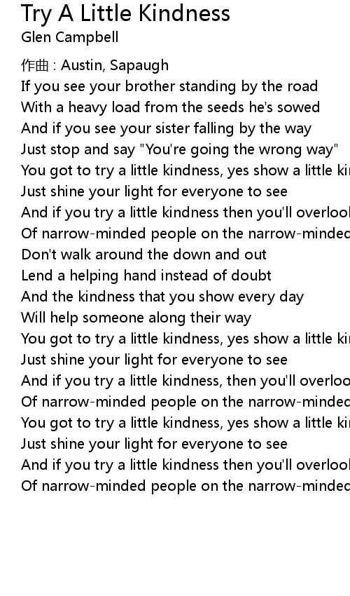 | And if you try a little kindness, then you'll overlook the blindness | |