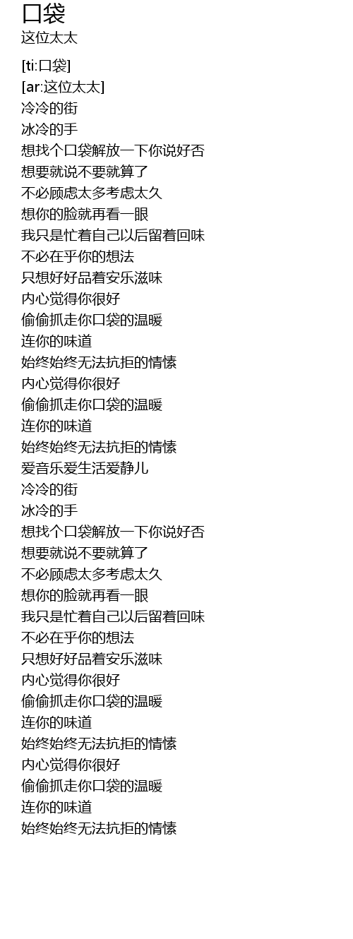 | [00:20.20] | 想找个口袋解放一下你说好否 |