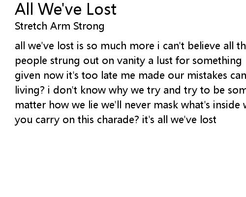 | all we've lost is so much more i can't believe all the things i see so many people strung out on vanity a lust for something more so much more than we're given now it's too late me made our mistakes can't we change the way we're living? i don't know why we try and try to be something more than we are not no matter how we lie we'll never mask what's inside will tyou be left standing? can you carry on this charade? it's all we've lost |