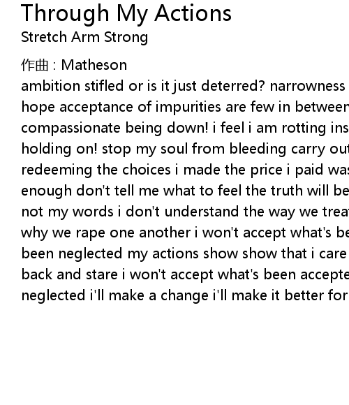 | ambition stifled or is it just deterred? narrowness of scope the new kind of hope acceptance of impurities are few in between losing myself i was a compassionate being down! i feel i am rotting inside help me! reality subsides holding on! stop my soul from bleeding carry out! the state of my mind' s redeeming the choices i made the price i paid was never enough it will never be enough don' t tell me what to feel the truth will be revealed through my actions not my words i don' t understand the way we treat each other i don' t understand why we rape one another i won' t accept what' s been accepted i' ll love all that' s been neglected my actions show show that i care i won' t sit back i won' t sit back and stare i won' t accept what' s been accepted i' ll love all that' s been neglected i' ll make a change i' ll make it better for you |