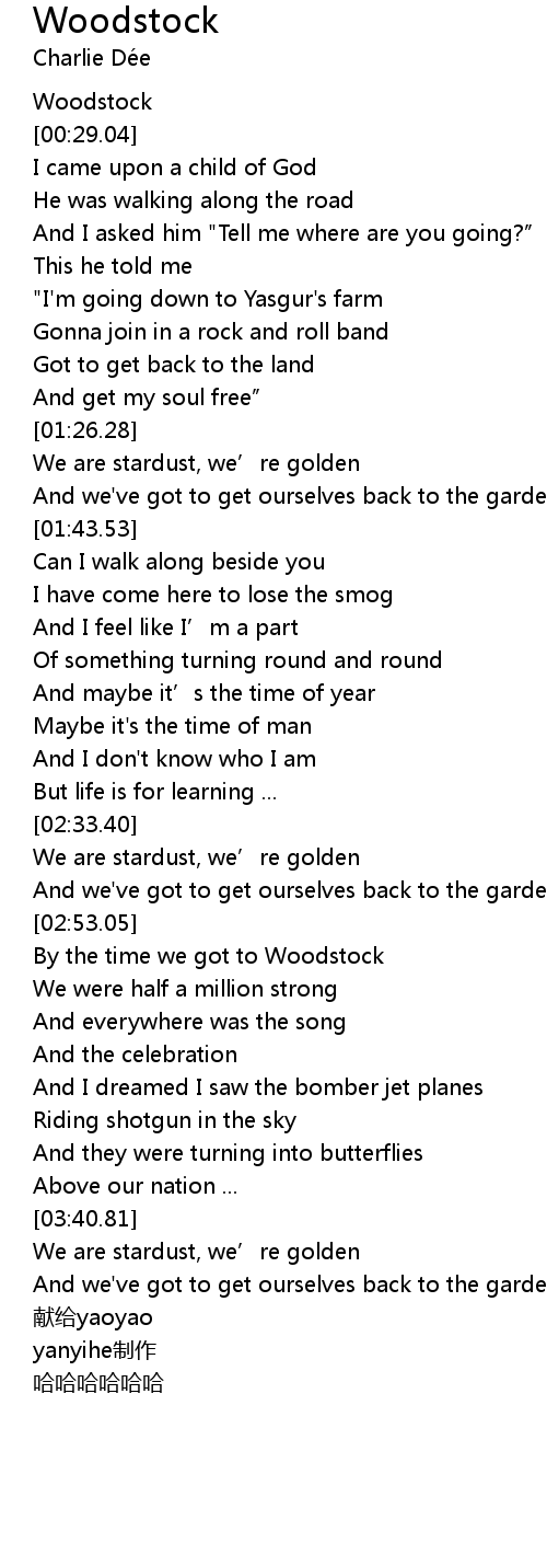 | [03:00.36] | By the time we got to Woodstock |