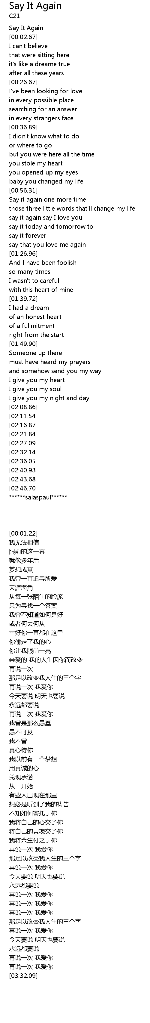 | [02:57.29][02:16.87] | those three little words that'll change my life |
