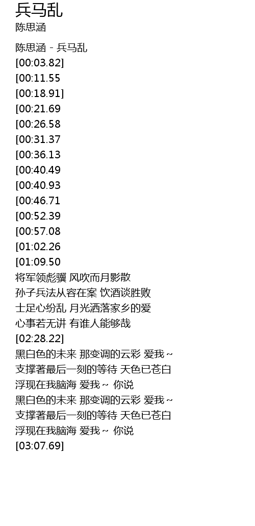 | [00:01.12] | 陈思涵 - 兵马乱 |