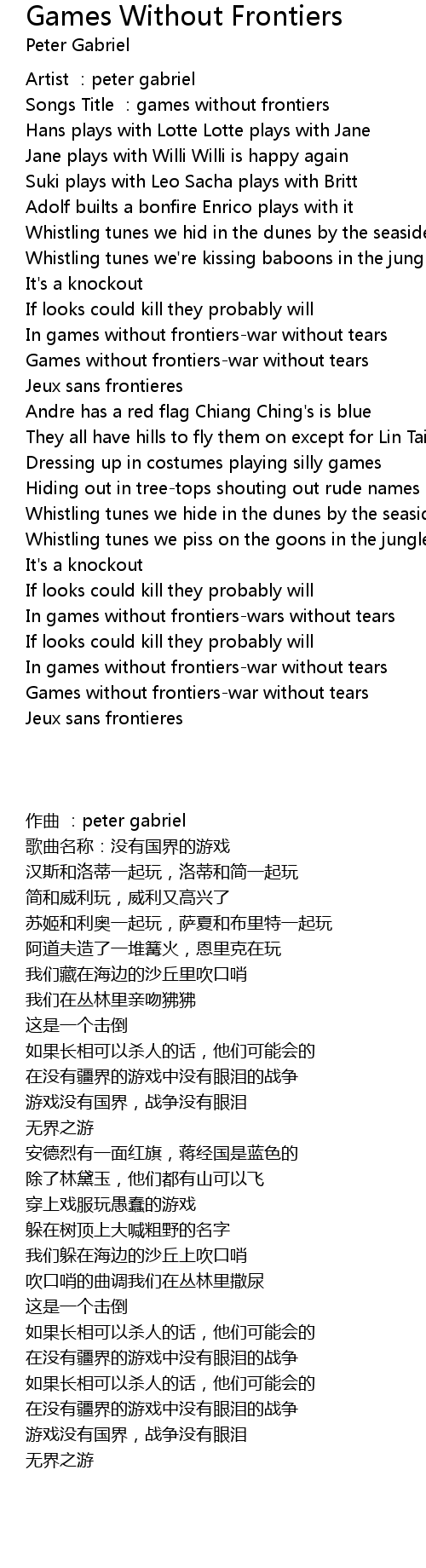 | [00:02.348] | Songs Title :games without frontiers |