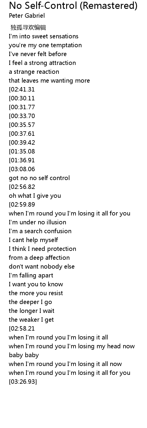 | [03:15.77][03:08.06][03:00.45][02:52.94][02:03.14][01:55.39][01:48.17][01:39.71][00:54.40][00:46.32] | I got no no self control |