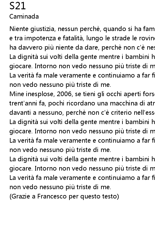 | Mine inesplose, 2006, se tieni gli occhi aperti forse sopravviverai. S21, trent' anni fa, pochi ricordano una macchina di atrocita che non si e fermata davanti a nessuno, perche non c'e criterio nell' essere umano. | |
