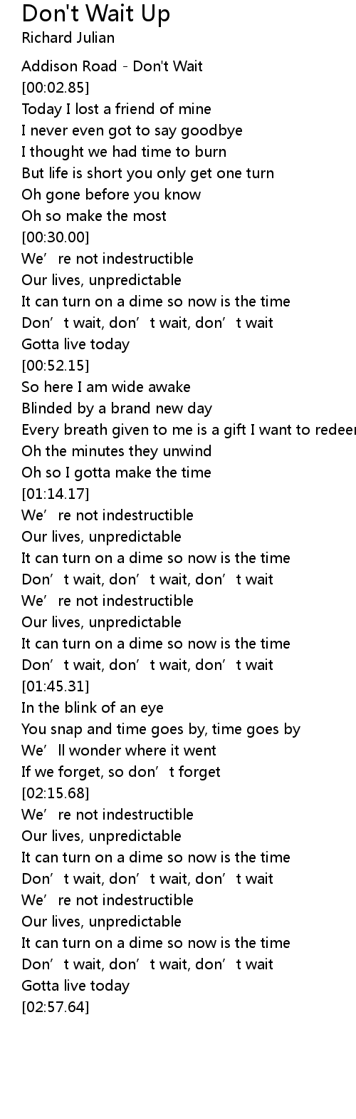 | [02:42.63] | Don’t wait, don’t wait, don’t wait |