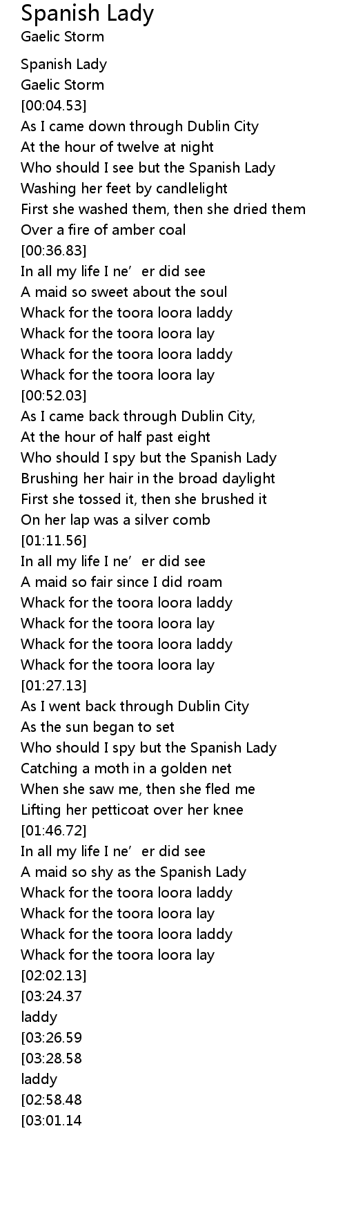 | [00:28.54] | Who should I see but the Spanish Lady |