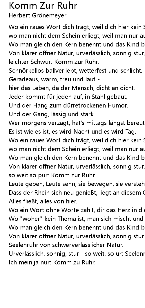 | Von klarer offner Natur, urverl sslich, sonnig stur das ist Ruhr. | |