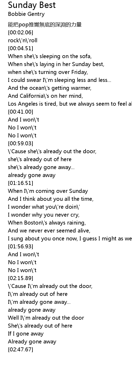 | [01:29.37] | When I' m coming over Sunday |