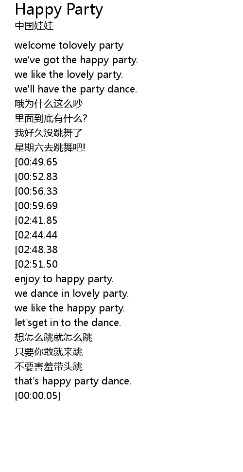 | [02:55.92][02:41.85][01:59.44][01:03.45] | let's party we like to |