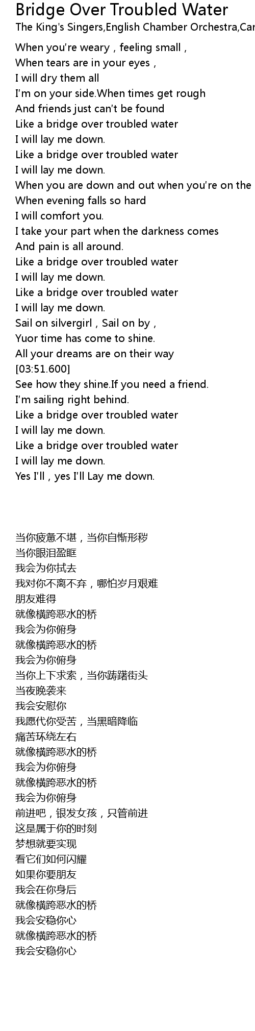 | [04:10.200] | Like a bridge over troubled water |
