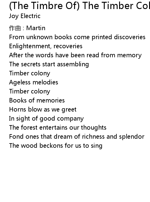 | Song | (The Timbre Of) The Timber Colony |