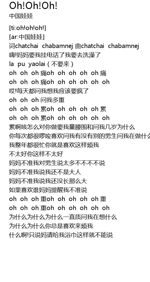 | [02:07.249] | oh oh oh zhòng oh oh oh oh oh oh |