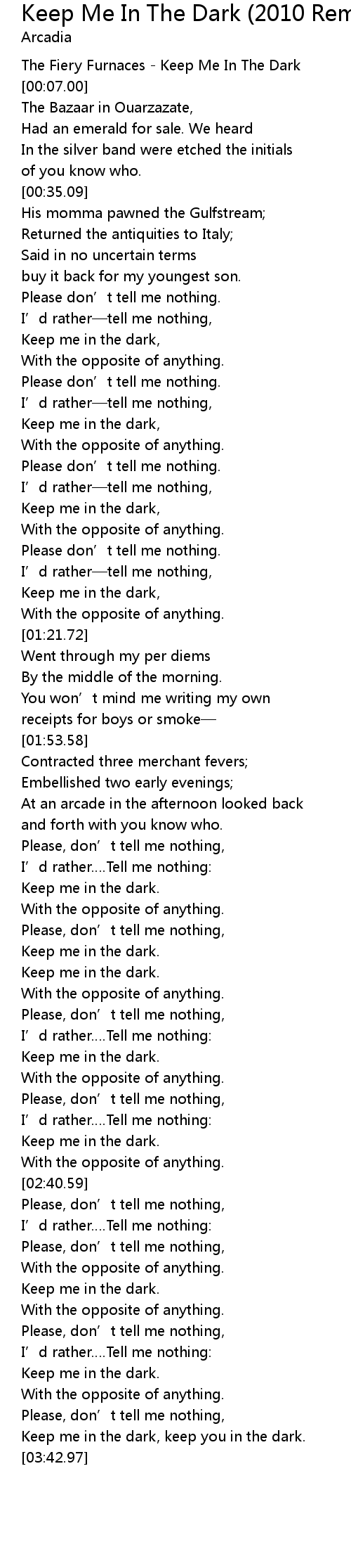 | [00:00.00] | The Fiery Furnaces Keep Me In The Dark |