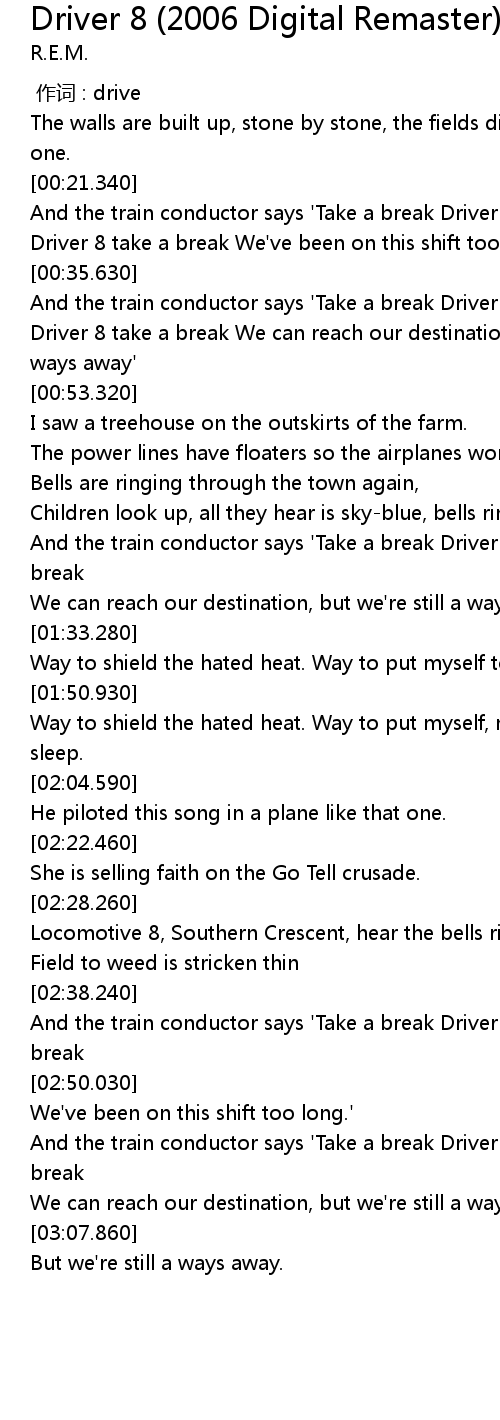 | [02:53.600] | And the train conductor says ' Take a break Driver 8, Driver 8 take a break |