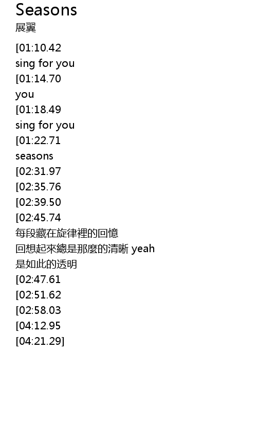 | [00:00.25][01:10.42][01:58.99][02:15.39][03:03.70][03:19.93][03:36.27][03:52.32][04:00.59][04:16.78] | I' ll sing for you |