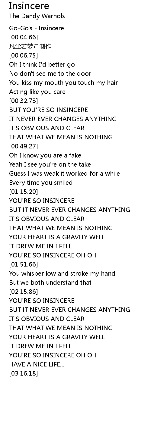| [01:16.05] | YOU'RE SO INSINCERE |