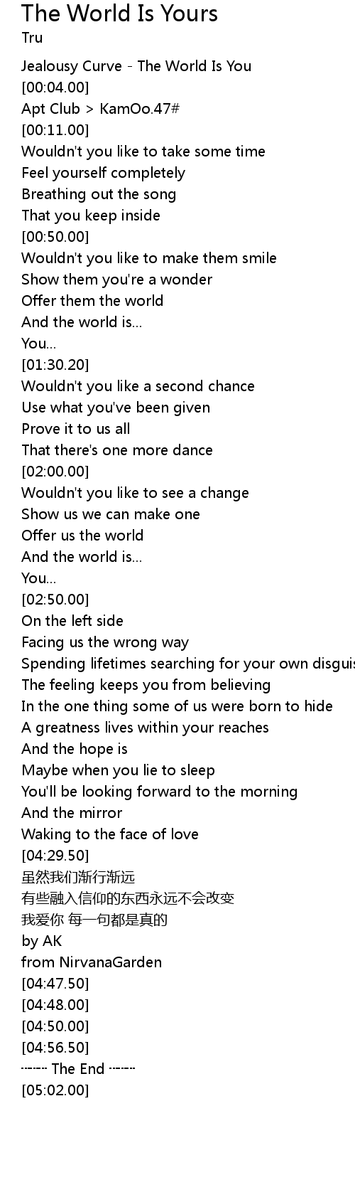 | [00:01.00] | Jealousy Curve - The World Is You |