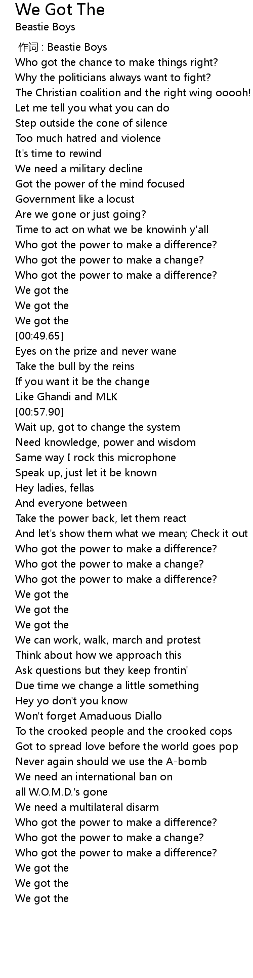 | [00:42.96] | Who got the power to make a change? |