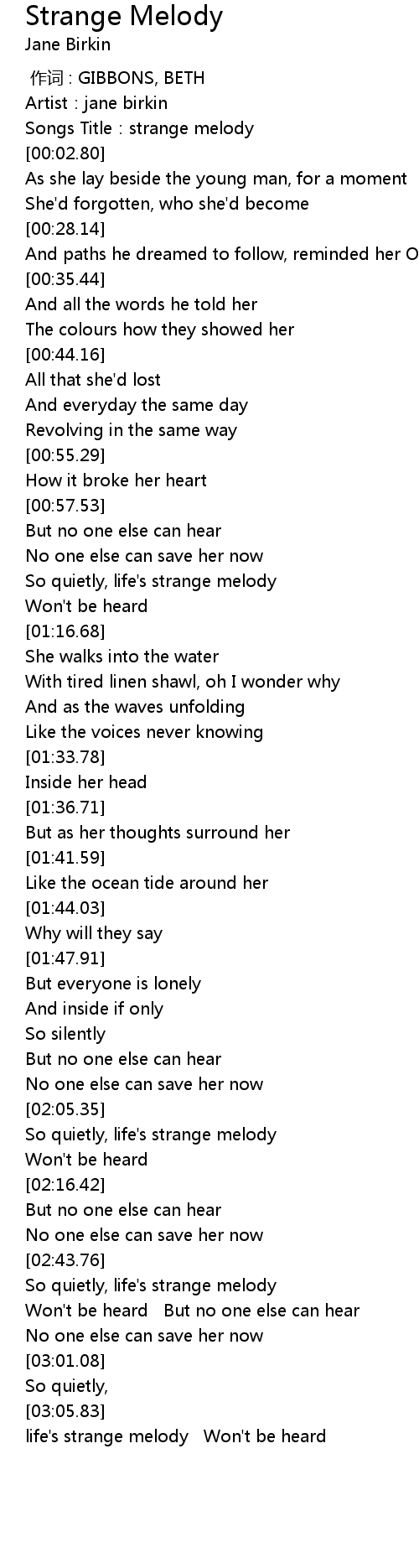 | [02:46.01] | So quietly, life's strange melody |