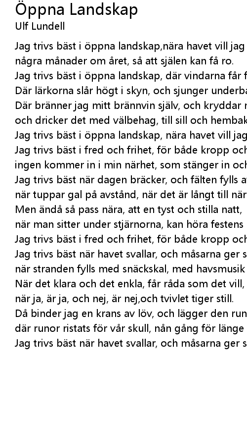 | Jag trivs bäst i öppna landskap, nära havet vill jag bo. | |