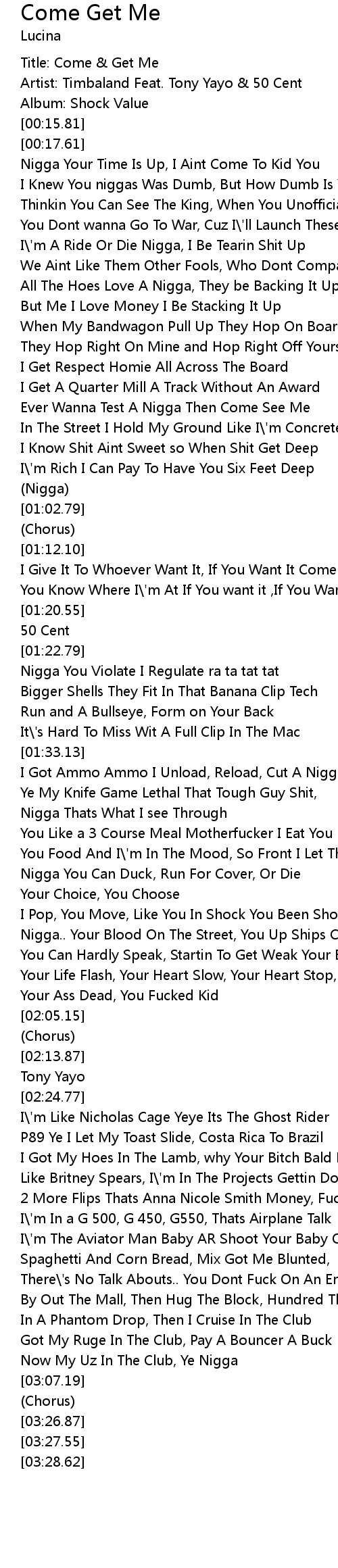 | [00:07.56] | Artist: Timbaland Feat. Tony Yayo & 50 Cent |