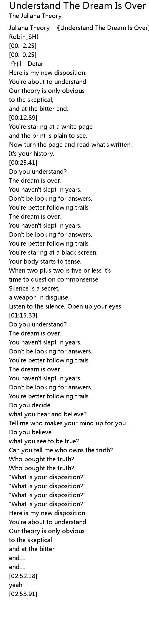 | [00:-6.64] | Juliana Theory -《Understand The Dream Is Over》 |