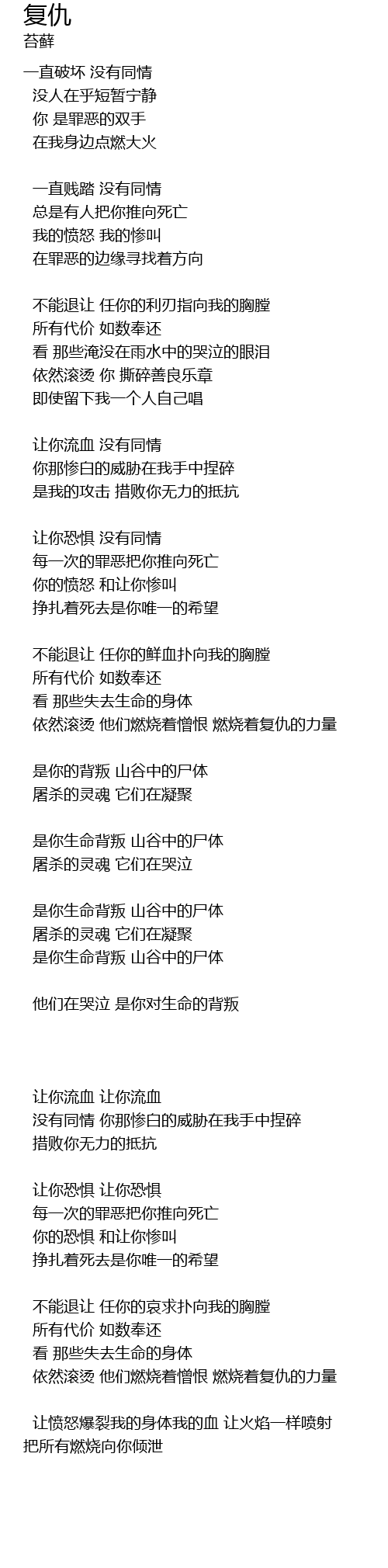 | 让愤怒爆裂我的身体我的血 让火焰一样喷射 把所有燃烧向你倾泄 |