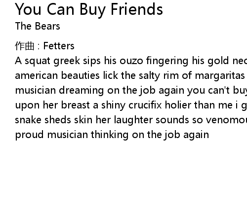 | A squat greek sips his ouzo fingering his gold neck chain robust cornfed american beauties lick the salty rim of margaritas in the corner lies a comatose musician dreaming on the job again you can' t buy love but you can buy friends upon her breast a shiny crucifix holier than me i guess sheds friends like a snake sheds skin her laughter sounds so venomous in his corner lies the once proud musician thinking on the job again |