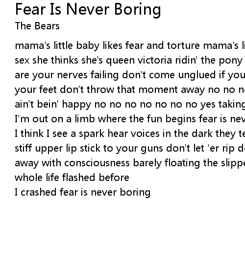 | mama's little baby likes fear and torture mama's little darling likes violent sex she thinks she's queen victoria ridin' the pony express oh no trouble now are your nerves failing don't come unglued if your heart skips a beat stay on your feet don't throw that moment away no no no no no no no yeah feeling good ain't bein' happy no no no no no no no yes taking care ain't being there | |