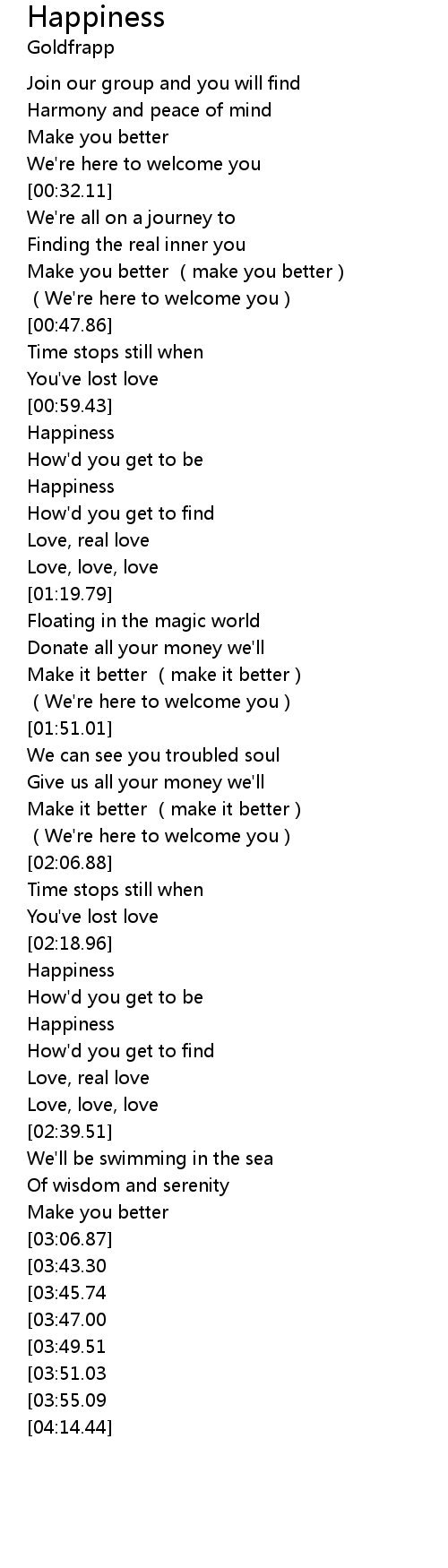| [03:59.20][03:43.30][03:27.29][03:11.60] | Happiness |