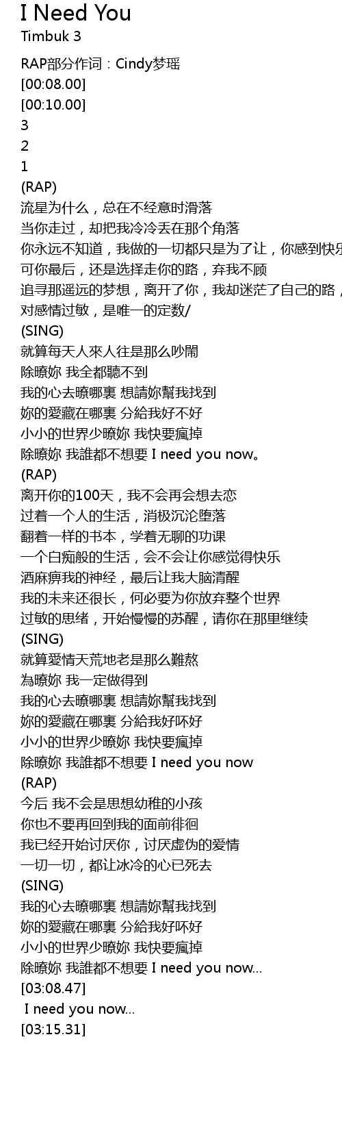 | [03:00.86] | chú liáo nǎi wǒ shuí dōu bù xiǎng yào I need you now... |