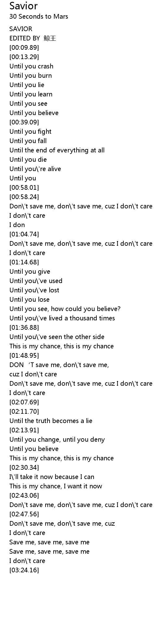 | [00:58.52] | Don' t save me, don' t save me, cuz I don' t care |