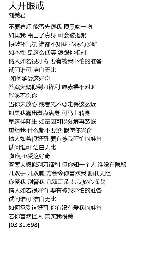 | [03:03.290] | 情人如若很好奇 要有被我吓怕的准备 |