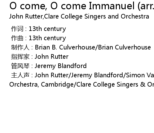 | [00:00.000] | 主人声 : John Rutter/Jeremy Blandford/Simon Vaughan/Clare College Orchestra, Cambridge/Clare College Singers & Orchestra |