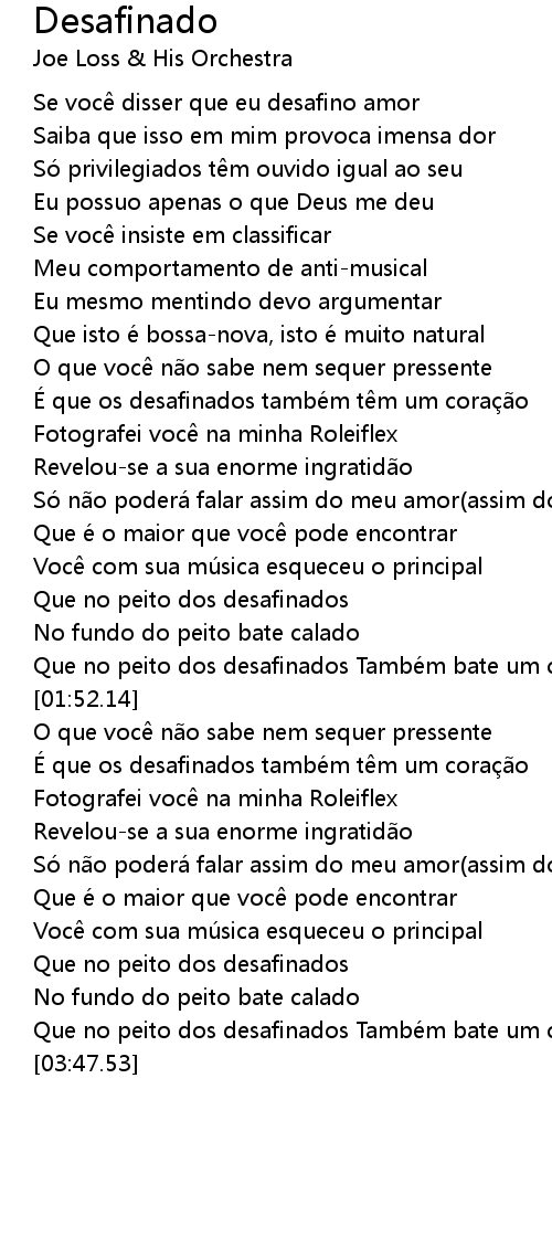 | [02:54.62] | É que os desafinados também têm um coração |