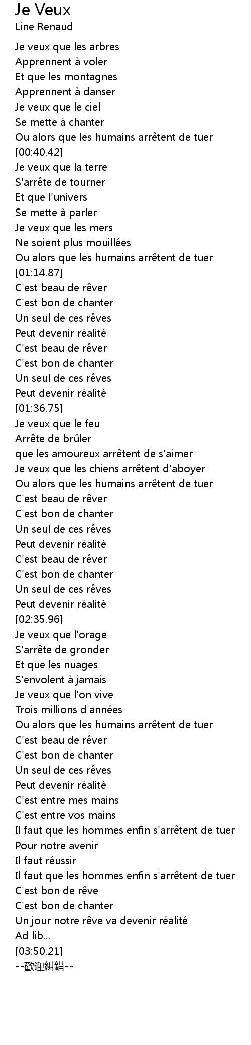| [01:55.61] | que les amoureux arrêtent de s'aimer |