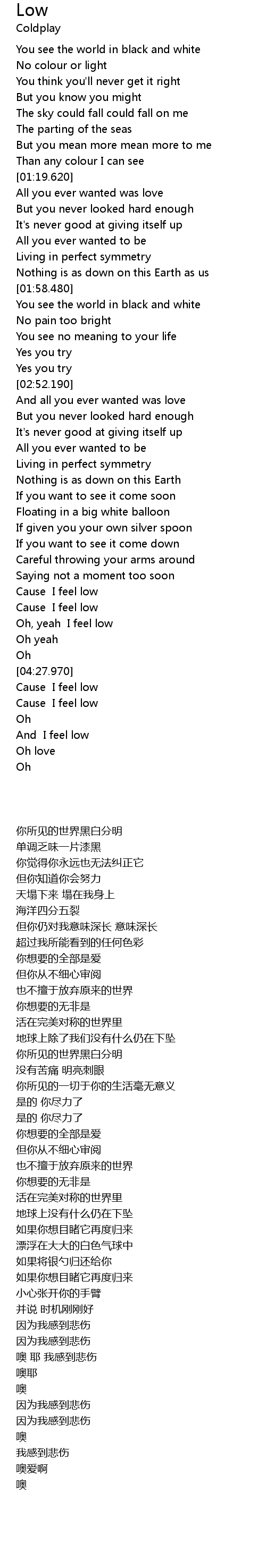 | [04:01.100] | Cause I feel low |